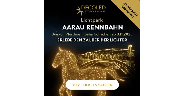 Wenn die Dämmerung über Aarau fällt, beginnt das Leuchten: Auf der historischen Pferderennbahn entsteht ein faszinierender Lichtpark mit über Dutzenden handgefertigten Skulpturen. Jede Figur erzählt ihre eigene Geschichte – mal verspielt, mal verträumt, immer beeindruckend.